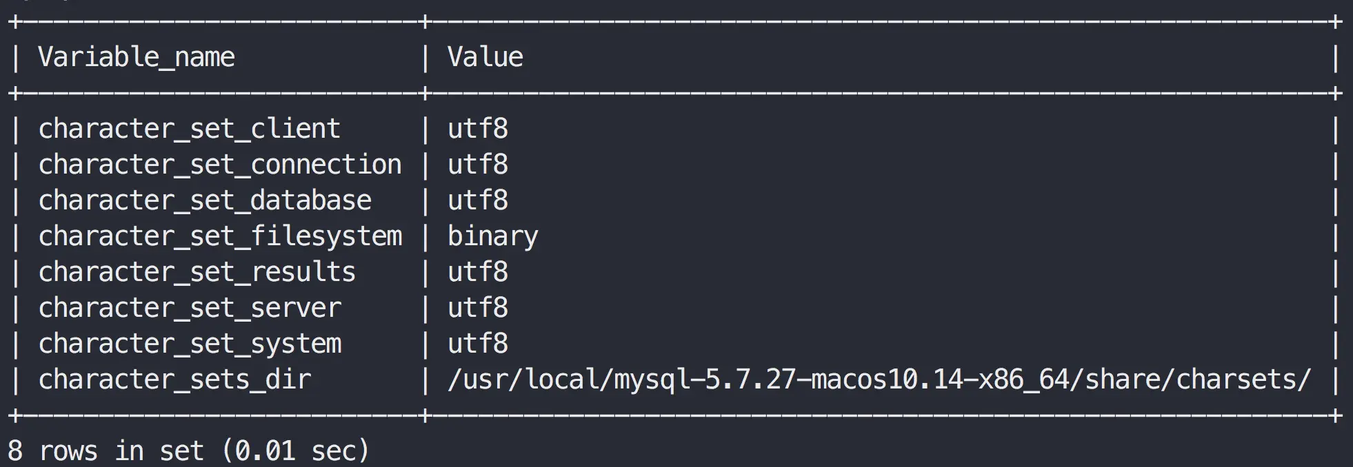 SHOW VARIABLES LIKE 'character%';