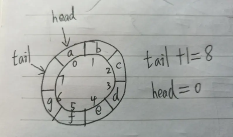 那么如何才能将tail+1在最大的情况下等于0呢,这里可以引入取余的方法。当tail=7时,tail+1=8,将它与n=8取余,8%8=0,就可以满足这个要求了,通用的公式就变成了**(tail+1)%n=head**,那一般情况满不满足这个公式呢,因为在一般情况下,tail+1都是小于n的,只有在上面所说的特殊情况时tail+1=n,所以不管怎么取余都是tail+1本身,也就是等于head了,所以队满的条件为**(tail+1)%n=head**。