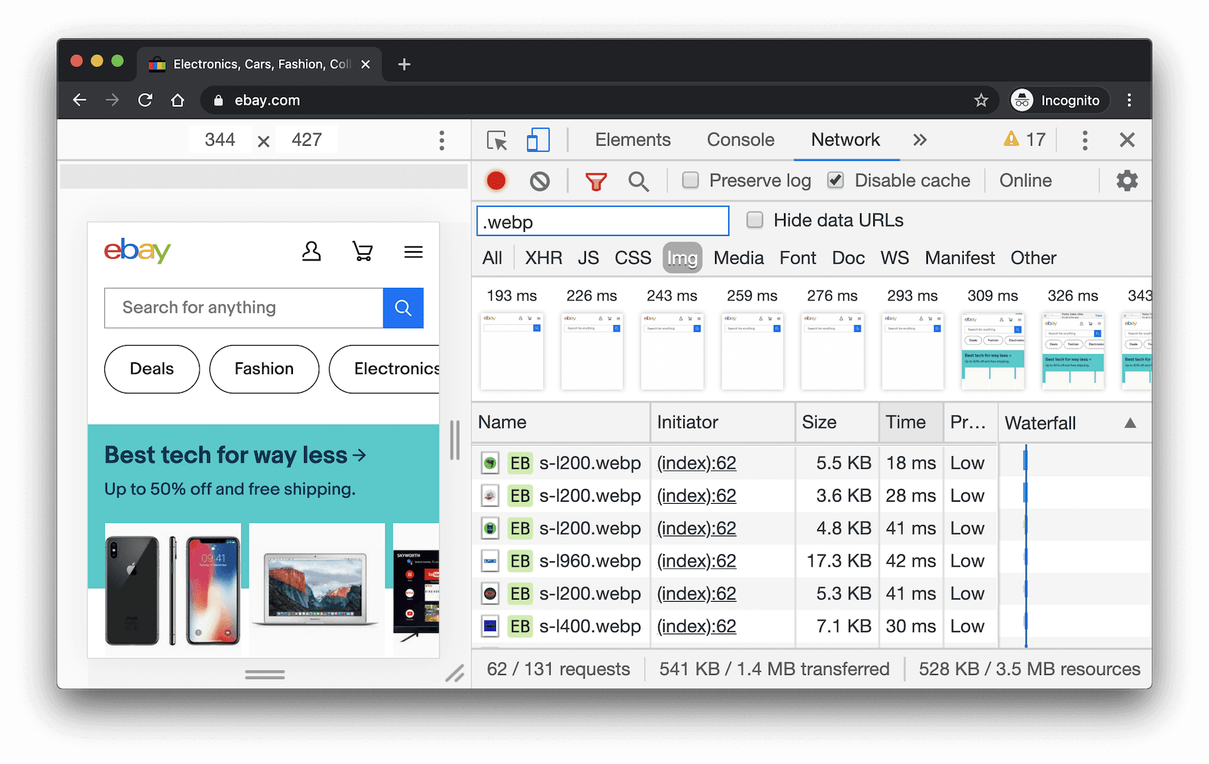 首先,eBay在iOS,安卓以及其他所有支持webp格式图片的浏览器上所有搜索结果使用了webp格式图片,搜索结果页是eBay用的图片最多的图片的页面。
