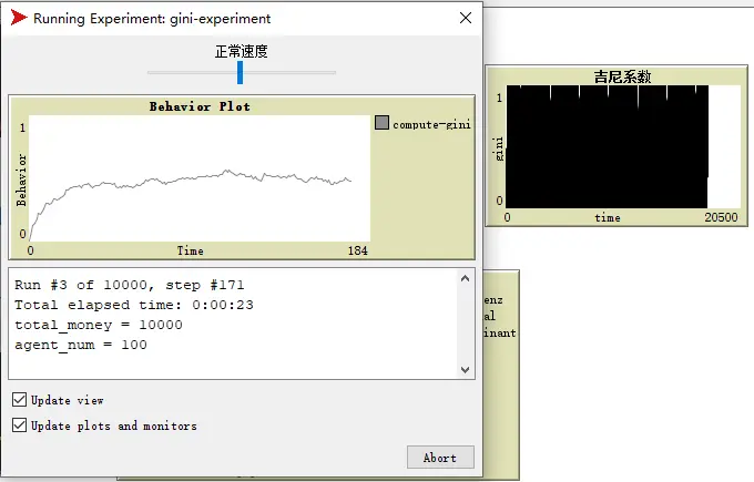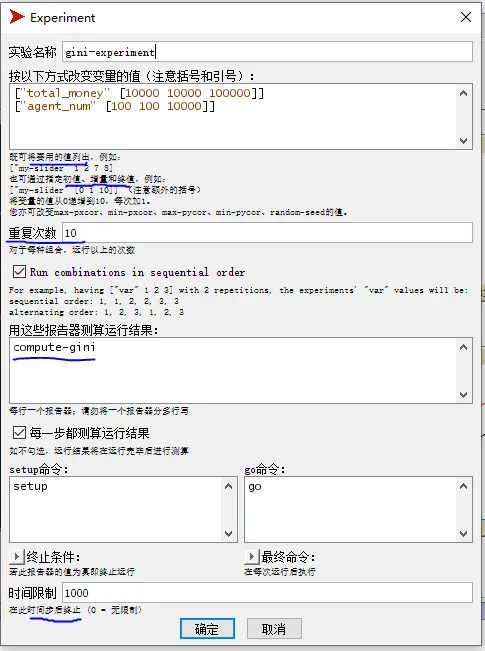 - 为了找出哪组参数控制下的 某个参数最高,我们需要重复实验,但是手动太麻烦了,我们可以用netlogo 自带的 “行为空间” 工具