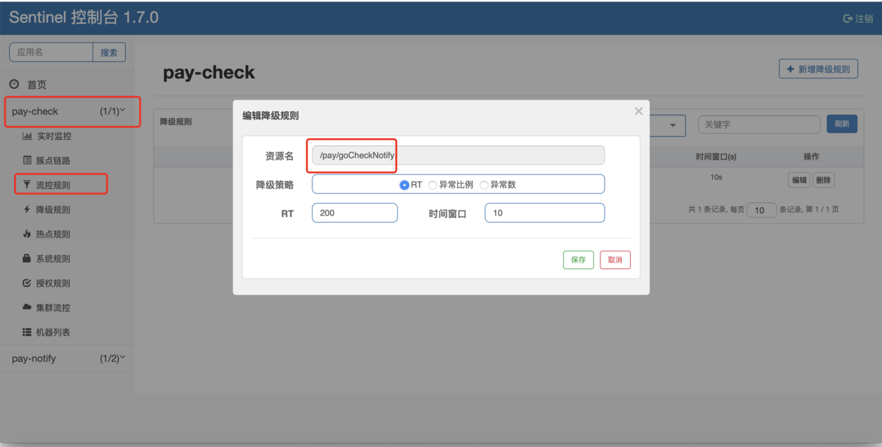 之后我们通过Sentinel控制台在微服务节点pay-check中针对该资源配置降级规则,如下图所示: