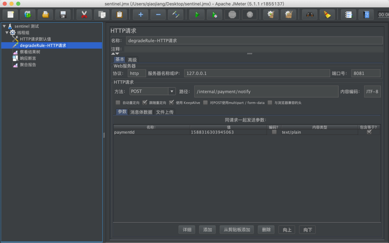 从使用方向上看熔断降级规则逻辑的发生,是发生在服务消费方,而不是服务提供方。以上述例子举例,pay-notify服务除了针对自身接口进行限流外,pay-check对pay-notify服务的调用也可以进行熔断降级处理。这里我们将pay-check服务中对pay-notify服务接口的调用方法进行Sentinel资源定义,代码如下: