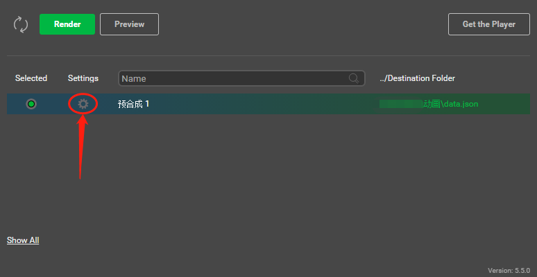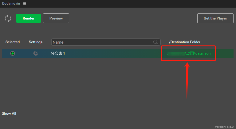 最后点击左上角绿色按钮 "Render" 等待渲染即可。渲染完毕后,打开保存的文件夹,你会发现文件夹里有个 data.json 文件,里面保存的就是动画数据。