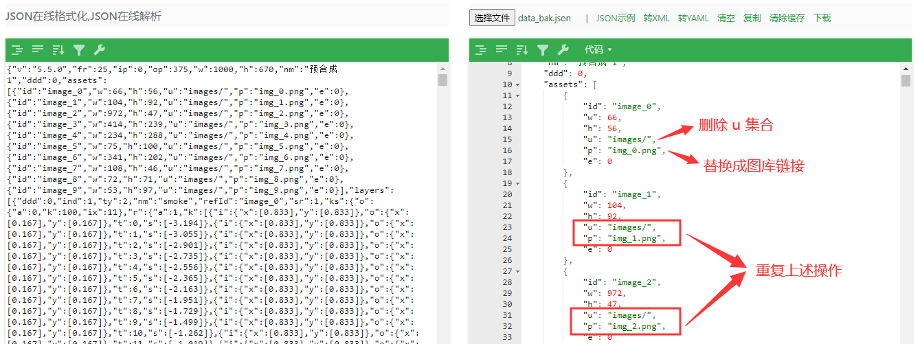 为了省带宽,我已经把 data.json 上传至 Github,如果有导出 images 文件夹,需要一同上传,否则无法正常显示!或者你也可以这样做:先把 images 上的图片上传至图库并获取每个图片的链接,记住,图片顺序不能乱。然后打开 data.json,把 "assets" 字段下的 u 集合都删除,然后 p 集合换成对应的图片链接,如图: