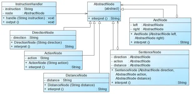 在图中,AbstractNode充当抽象表达式角色,DirectionNode、ActionNode和DistanceNode充当终结符表达式角色,AndNode和SentenceNode充当非终结符表达式角色。