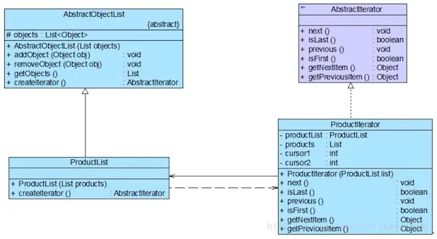 在图中,AbstractObjectList充当抽象聚合类,ProductList充当具体聚合类,AbstractIterator充当抽象迭代器,ProductIterator充当具体迭代器。