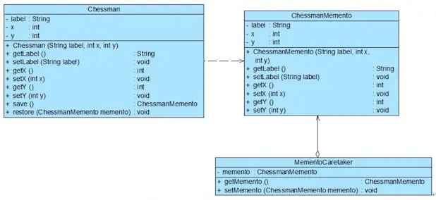 Chessman充当原发器,ChessmanMemento充当备忘录,MementoCaretaker充当负责人,在MementoCaretaker中定义了一个ChessmanMemento类型的对象,用于存储备忘录。