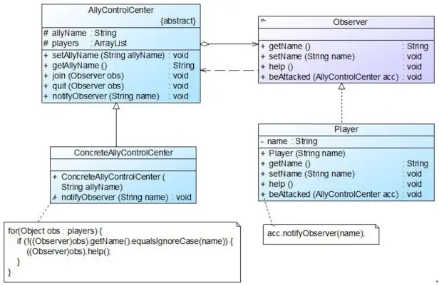 在图中,AllyControlCenter充当目标类, ConcreteAllyControlCenter充当具体目标类,Observer充当抽象观察者,Player充当具体观察者。