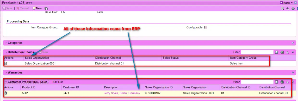 (1) Customer product IDs / Sales” (relationship type PRDSCP on product master data): contains the information downloaded from ERP (2) Customer product IDs” (relationship type PRDCPN, data stored in table COMM_IL_PRDCPN, alternative ID “CUSTOMER_ID”): contains information directly maintained in CRM