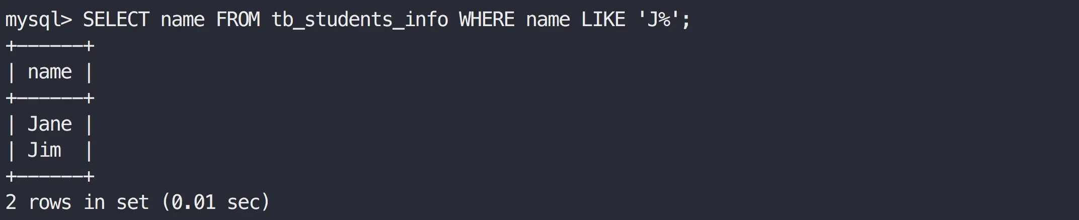 SELECT name FROM tb_students_info WHERE name LIKE 'J%';