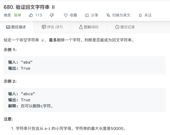 680. 验证回文字符串 Ⅱ