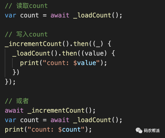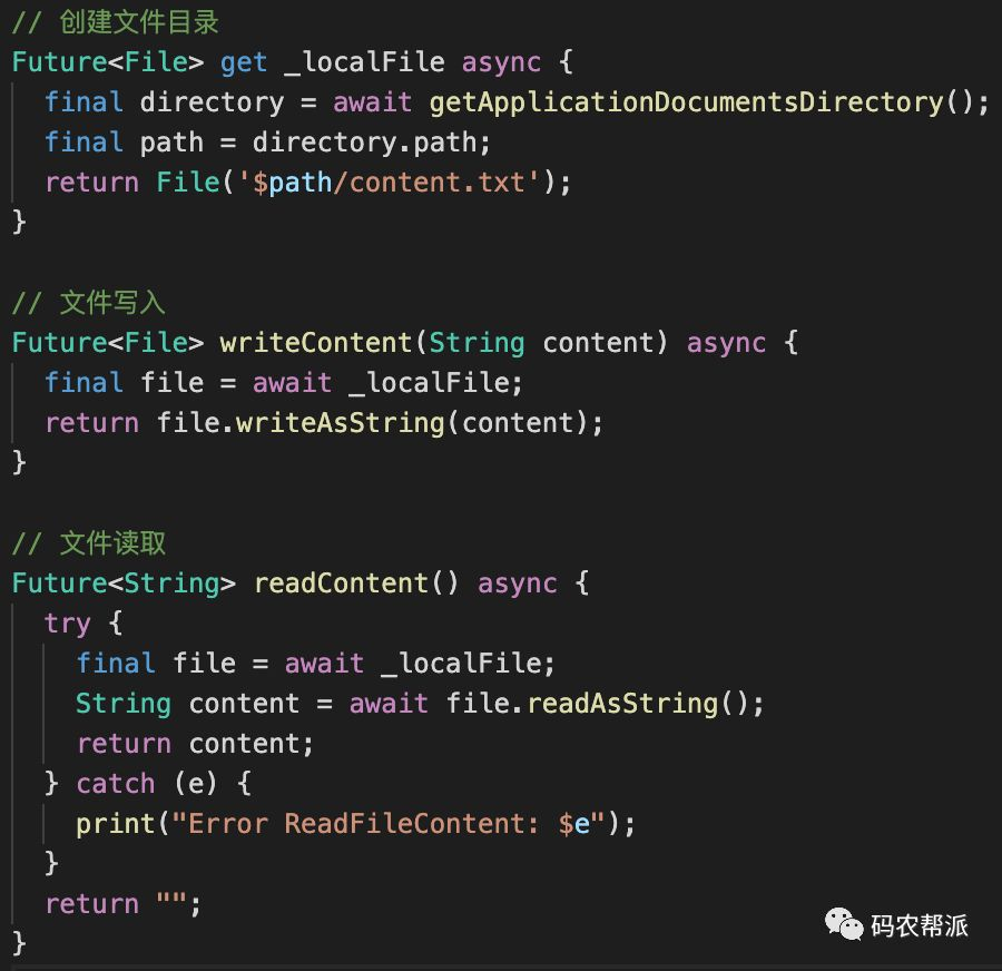 // 写文件writeContent("Hello World!");// 读取文件readContent().then((content) => print(content));var content = await readContent();除了字符串的读取,Flutter还提供了二进制的读写,支持图片、压缩包等以二进制流的方式读写文件,读写的方式可以参考: