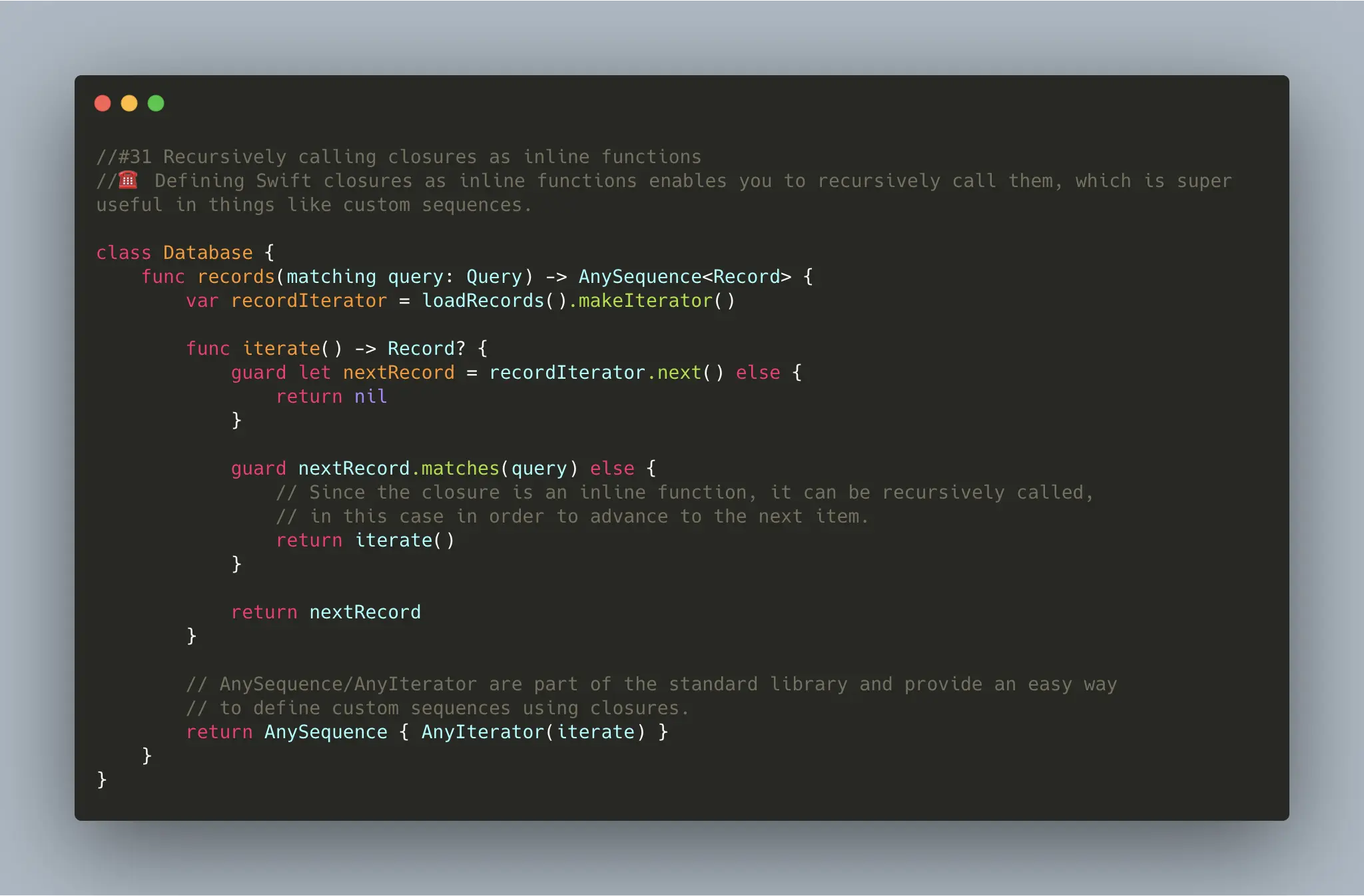 AnyIterator 有一个初始化器,可以传入一个闭包,AnyIterator 会把这个闭包的内容作为调用 next() 时执行的内容。这样创建一个 Iterator 时可以不用创建一个新的 class 或 struct。
