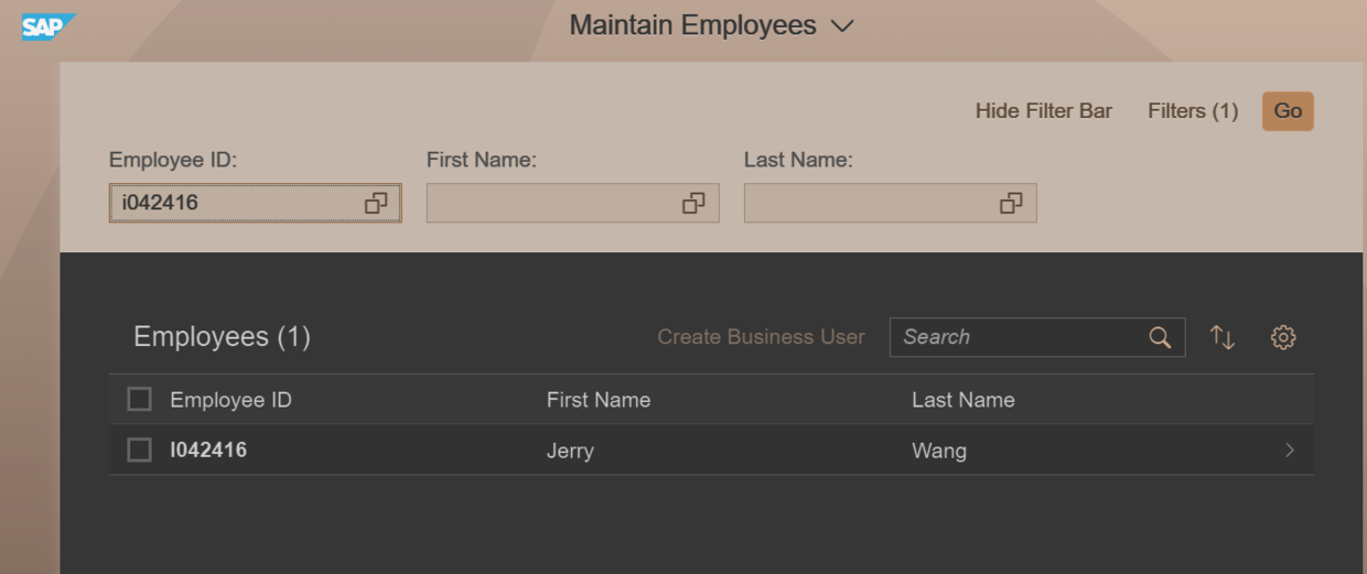 The created employee could be searched in Fiori UI: