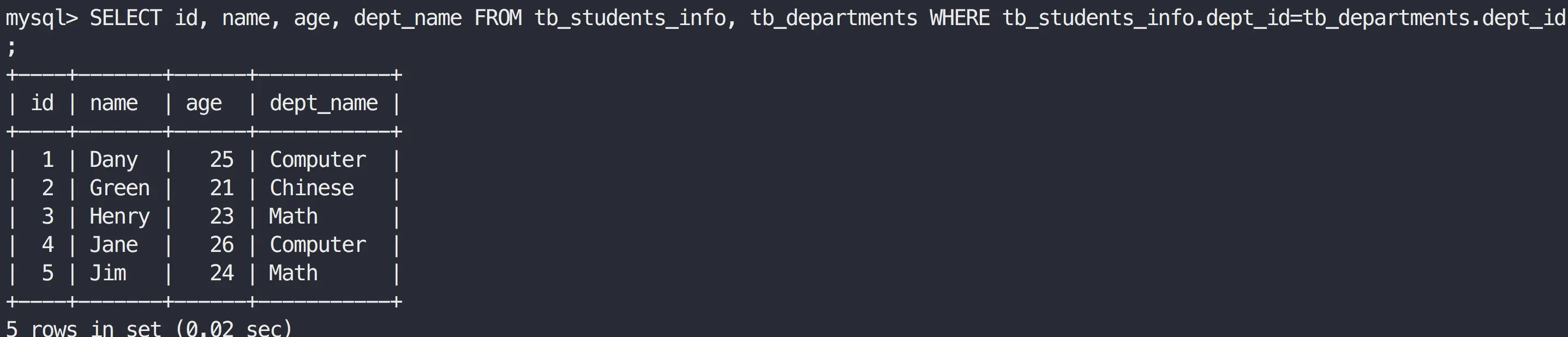 SELECT id, name, age, dept_name FROM tb_students_info, tb_departments WHERE tb_students_info.dept_id=tb_departments.dept_id;