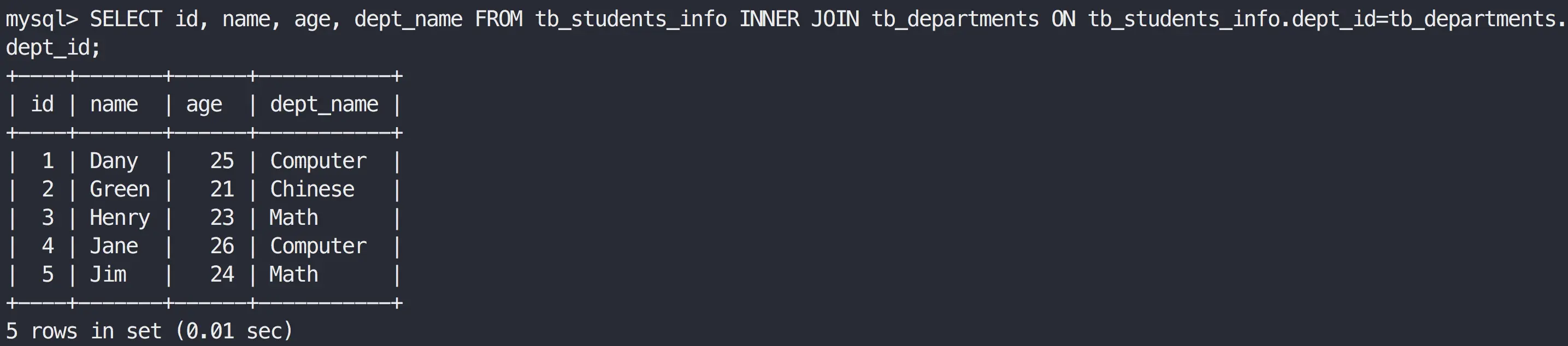 SELECT id, name, age, dept_name FROM tb_students_info INNER JOIN tb_departments ON tb_students_info.dept_id=tb_departments.dept_id;