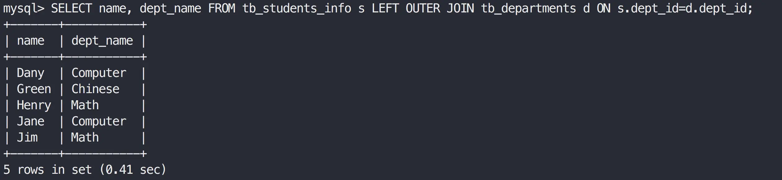 SELECT name, dept_name FROM tb_students_info s LEFT OUTER JOIN tb_departments d ON s.dept_id=d.dept_id;