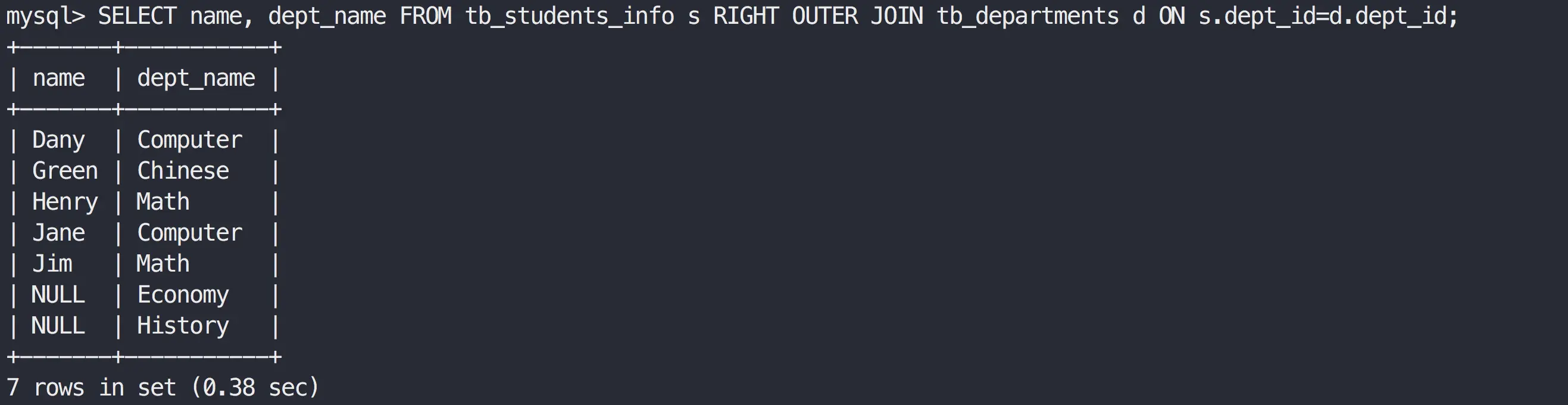 SELECT name, dept_name FROM tb_students_info s RIGHT OUTER JOIN tb_departments d ON s.dept_id=d.dept_id;