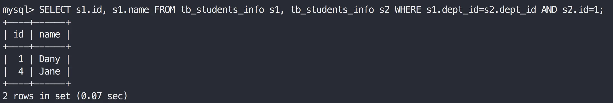 SELECT s1.id, s1.name FROM tb_students_info s1, tb_students_info s2 WHERE s1.dept_id=s2.dept_id AND s2.id=1;