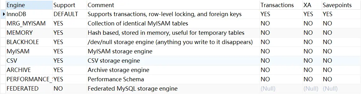 其中,Engine代表存储引擎的名称,Support表示mysql是否支持此存储引擎,default表示当前mysql数据库默认的存储引擎,Comment表示对存储引擎的描述,Transactions表示表示该存储引擎是否支持事务。XA代表当前的存储引擎是否支持分布式事务。Savapoints表示是否支持事物的部分回滚。当然,如果连事务都不支持,那么就更不用提支持事务回滚了。