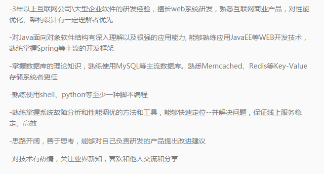 既然是社招,一定的工作经验是必须的,三年以上最好,上面的几个JD里也体现了。 然后是技术方面,结合自己的体会,总结下面几点: