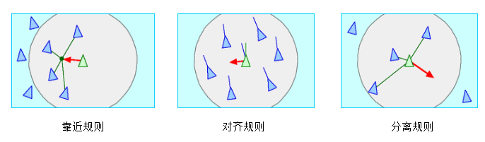 鸟的飞行方向取决于 周围鸟的飞行方向。具体来说是:周围鸟的飞行方向 的平均矢量。