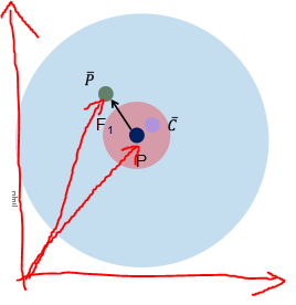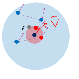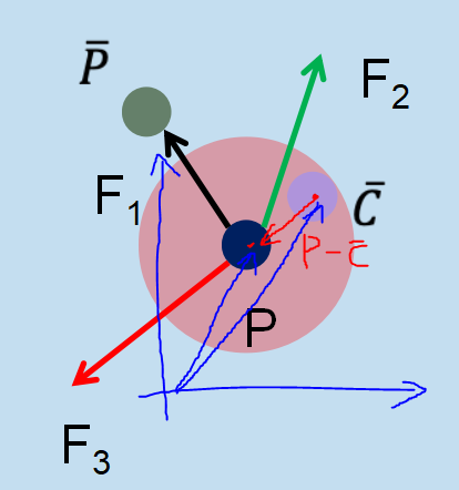 因为是斥力,所以要 远离碰撞节点的重心(浅紫色的点),方向为矢量( P- C平均) 的方向。