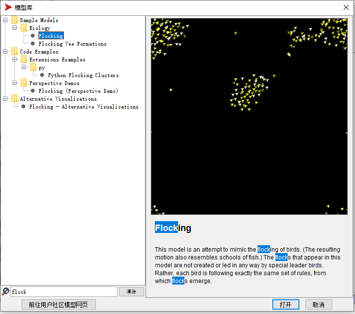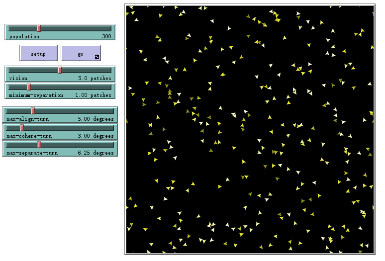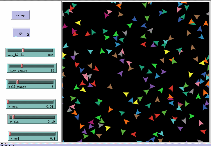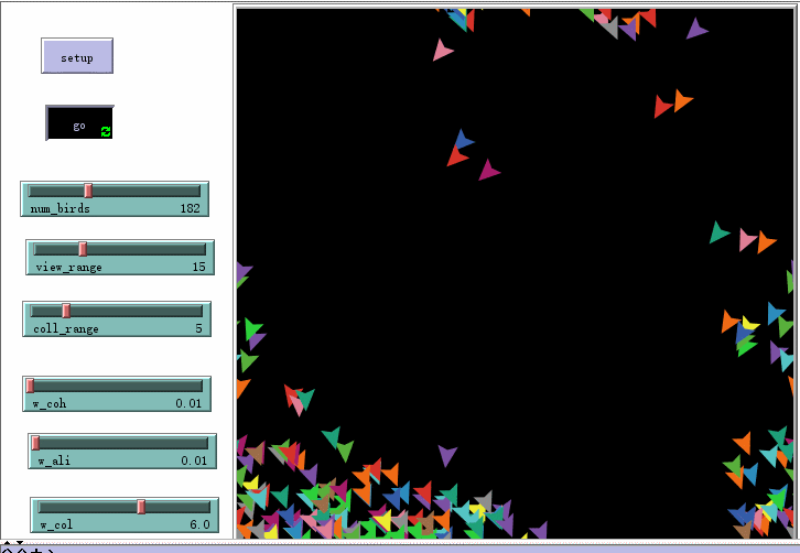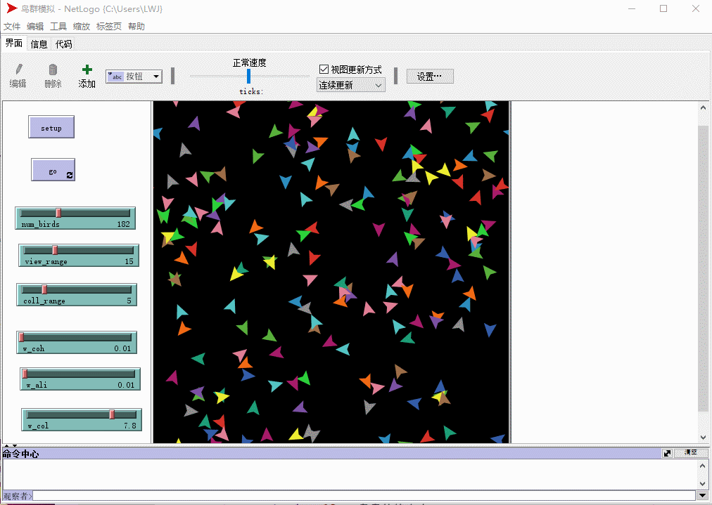 除此之外,还可以用netlogo自带的 flocking 模型,改模型也是能模拟鸟群飞行的模型之一。