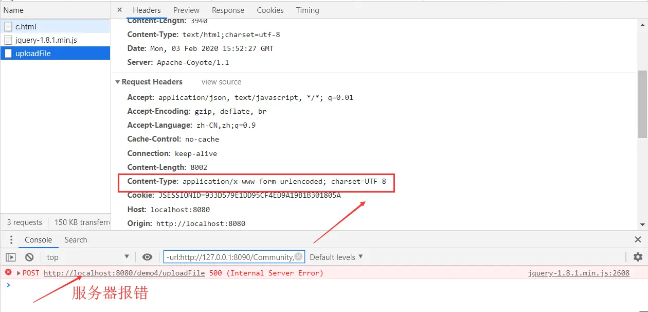 在 ajax 中 contentType 设置为 false 是为了避免 JQuery 对其操作,从而失去分界符,而使服务器不能正常解析文件。