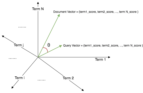 - 空间的维:一个维代表一个 term,某个 term 通过 TF/IDF 以及字段的长度会计算出一个 doc 的分数,那么这个分数就是这个文档在这个维的坐标。所以计算出多个 term 的分值 (term1_score; term2_score; term3_score) 就相当于确定了一个文档在多个维的坐标,也就可以画出他的向量
