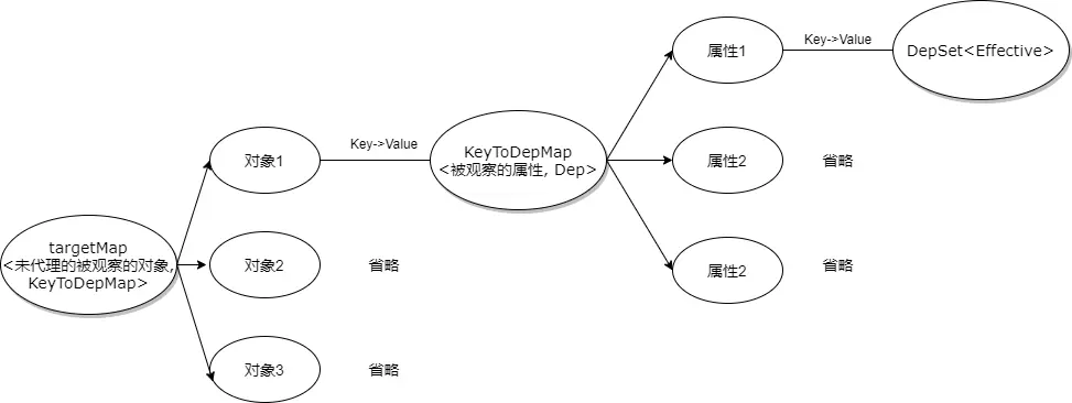 存放所有对象依赖筐的实例对象只有一个,叫做targetMap,它是分成三层的树状数据结构,第一二层是Map数据类型,第三层是Set数据类型。它大体上是按照如下的结构进行组织的: