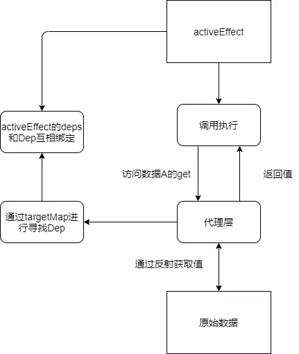 activeEffect:当前正在执行的Effect实例。Dep通过targetMap进行查找得到访问的数据的Dep筐,执行一个次activeEffect函数,可能有多个依赖绑定,也可能没有,完全取决于函数中对响应型数据的访问情况。