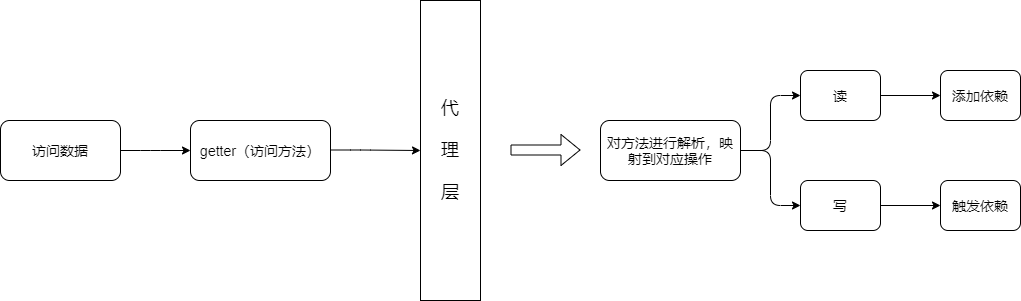 - 数据响应系统实现的思路是:在Vue2.0中getter是搜集依赖,而setter是触发依赖,这是狭义的理解,而广义的理解是读数据的时候进行依赖的绑定、写数据的时候进行依赖的触发。