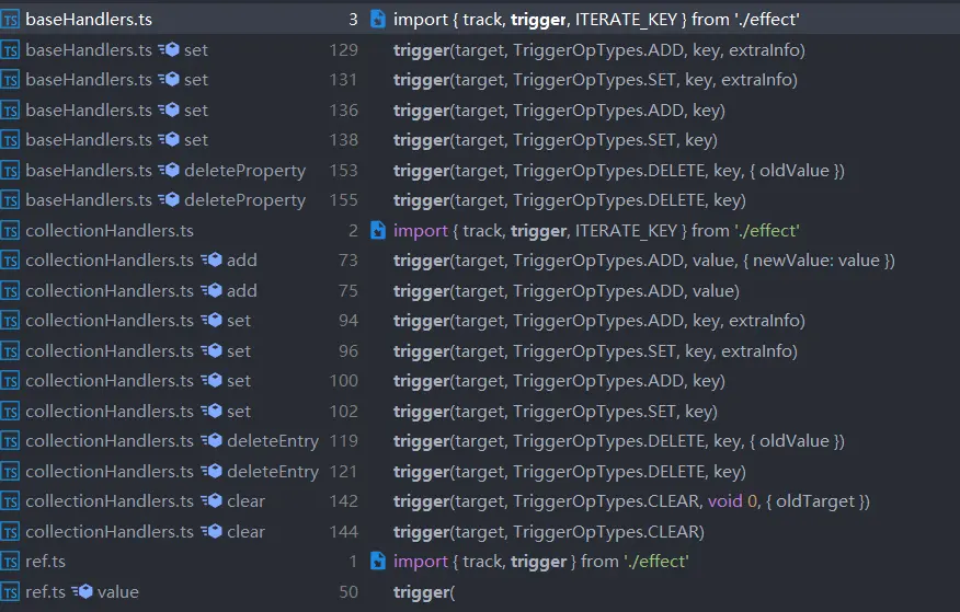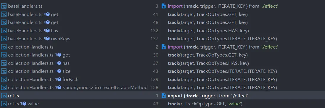 get、has、ownKeys代理拦截方法里面进行追踪。 - collectionHandlers.ts: