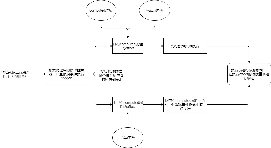 Vue有三种观察者:computed、watch、render。触发三者的回调函数执行的策略是不同的。这是在创建effect的时候使用了工厂模式和策略模式,根据传进来的策略来决定执行策略。触发依赖进行执行函数的代码说明了: