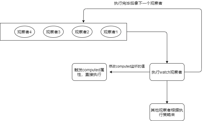 computed使用同步代码进行执行:如果在watch选项中修改到computed数据,那么搜集完后会同步执行,所以下一个观察者进行执行的时候拿到了最新数据。