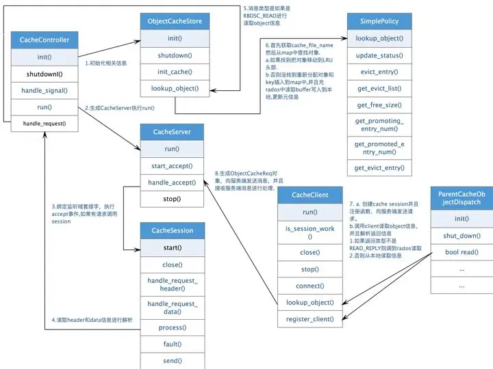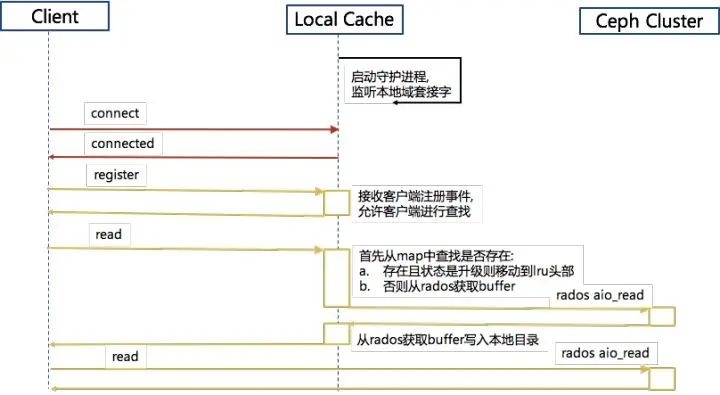 - 客户端librbd通过域套接字来连接缓存守护进程, 并且向缓存守护进程进行注册。
