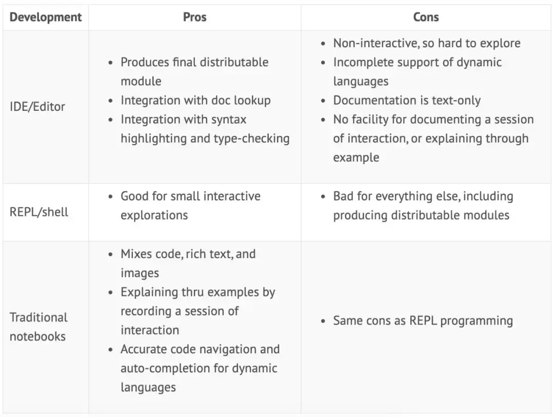 当你基于 prompt(或 REPL)开发,或者使用 notebook-oriented 开发系统(如 Jupyter Notebook)开发时,「探索」是最简单的。但这些系统的「编程」部分没有那么强大。这也是人们主要使用这类系统执行早期探索,然后转向 IDE 或文本编辑器的原因。