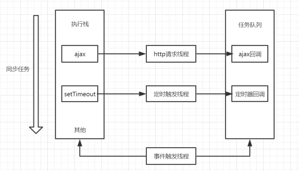 事件触发线程管理一个任务队列定时触发线程本身是一个同步任务,但其中的回调函数是异步任务,所以js引擎线程会通知定时器触发线程,当定时器触发线程接收到消息后,会在等待的时间后将回调函数放入到任务队列中去- 同样,