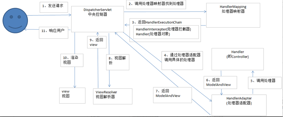 ⑴ 用户发送请求至前端控制器DispatcherServlet