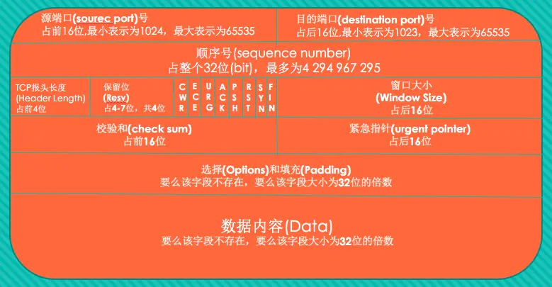 -顺序号(sequence number):这里的顺序号就是TCP的握手和挥手的seq,它占32位,标识了TCP报文中第一个字节在传输方向中对应的字节序号。当SYN时,SN(sequence number)=ISN(随机值)单位是byte。比如发送端发送的一个TCP包净荷(不包含TCP头)为12byte,SN为5,则发送端接着发送的下一个数据包的时候,SN应该设置为5+12=17。通过序列号,TCP接收端可以识别出重复接收到的TCP包,从而丢弃重复包,同时对于乱序数据包也可以依靠序列号进行重排序,进而对高层提供有序的数据流。另外如果接收的包中包含SYN或FIN标志位,逻辑上也占用1个byte,应答号需加1