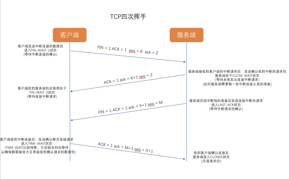FIN后,发送一个ACK给客户端,确认序号为收到序号+1(与SYN相同,一个FIN占用一个序号),服务端进入CLOSE_WAIT状态。 - 服务端在回复完客户端的