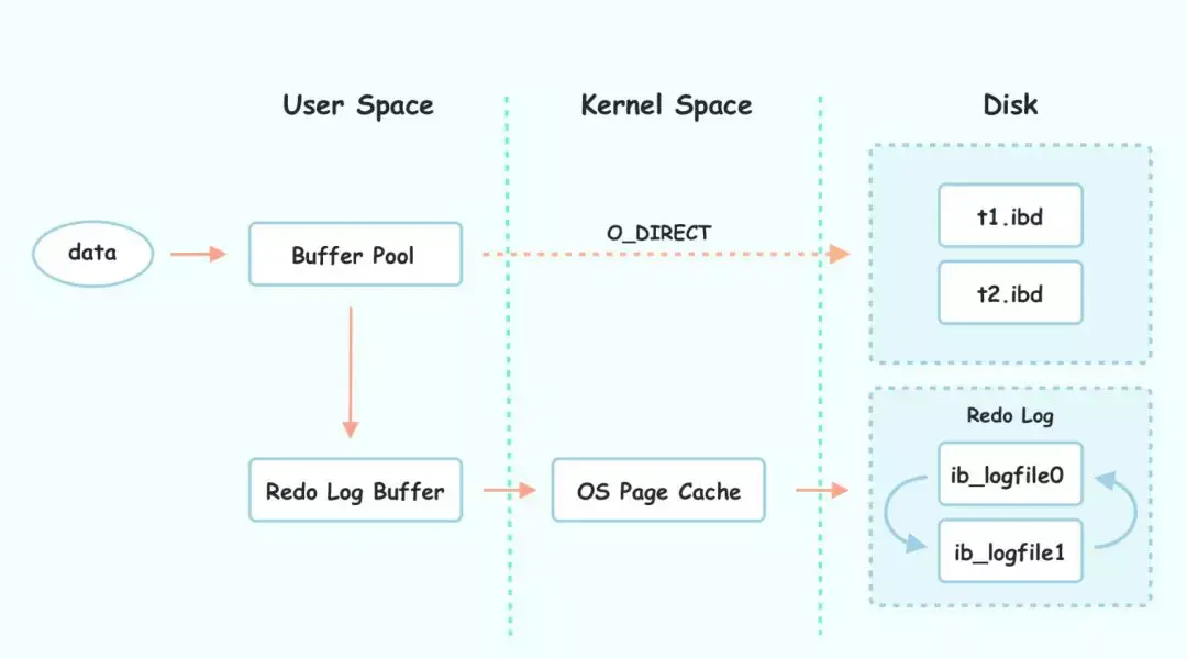 前面两篇文章已经描述过,InnoDB 使用 Redo Log 来保证数据的一致性和可持久性,它采用 WAL 机制,即先写日志再写数据。具体来说,InnoDB 进行写操作时,先将数据操作记录在 log buffer 中,然后将 log buffer 中的数据刷到磁盘 log file 中,后续数据再落到数据 ibd 文件这一步骤由 checkpoint 来保证。其数据流如下图所示。