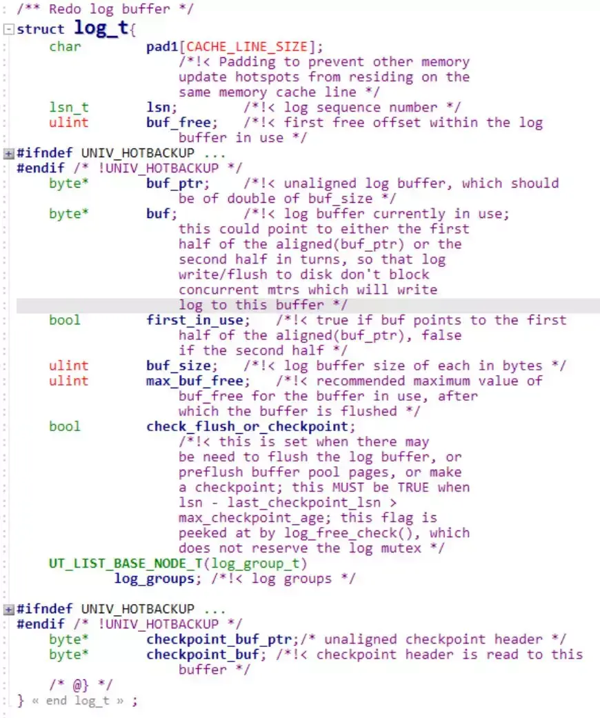 InnoDB 使用 log_sys 这个对象来管理 Redo Log Buffer,其结构体为 log_t,它在源码中的定义(部分数据被折叠)如下。
