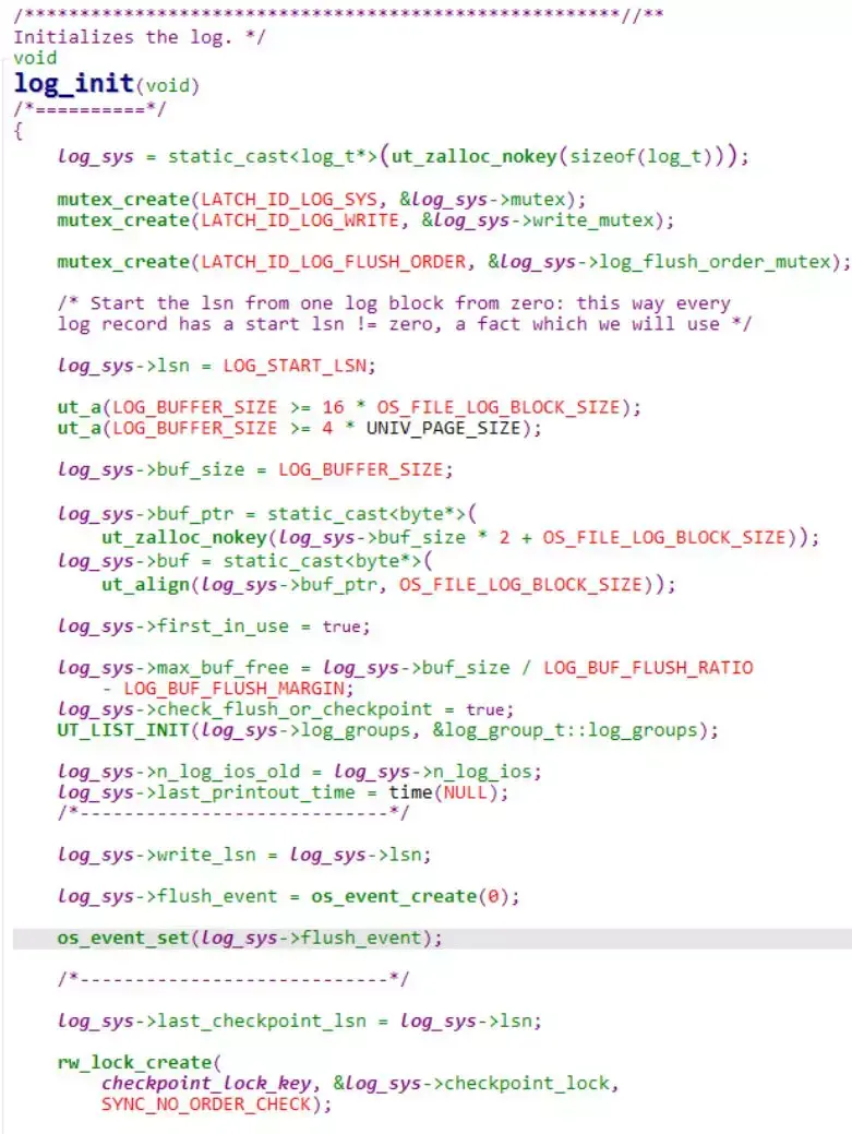 log_sys 对象是在 InnoDB 启动时,由 log_init() 函数负责初始化,主要是对元数据信息进行赋值操作。其部分代码实现如下: