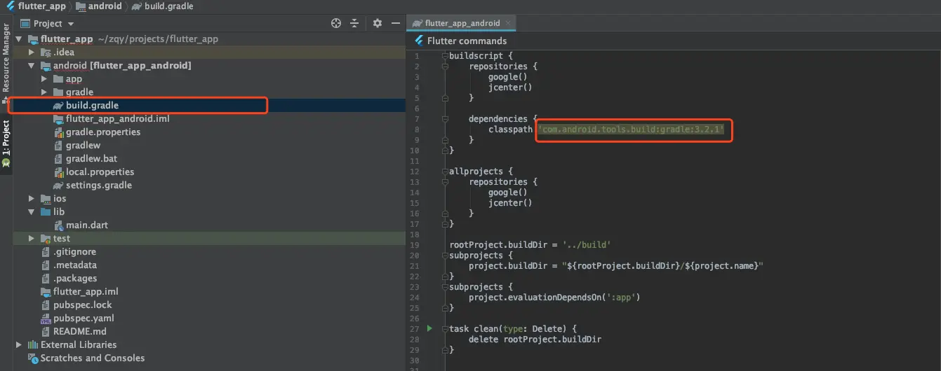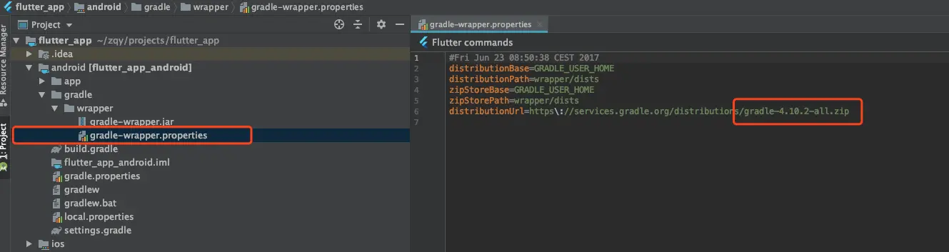 如果只想运行现有的Gradle构建,那么如果构建中有Gradle Wrapper,则可以通过构建根目录中的gradlew(macOS下使用这个)和/或gradlew.bat(Windows下使用这个)文件进行识别,而无需安装Gradle。默认新建立的Flutter项目都会有这个文件的,如下图所示,项目使用Gradle 4.10.2版本进行构建,你也可以手工修改这个文件版本信息。