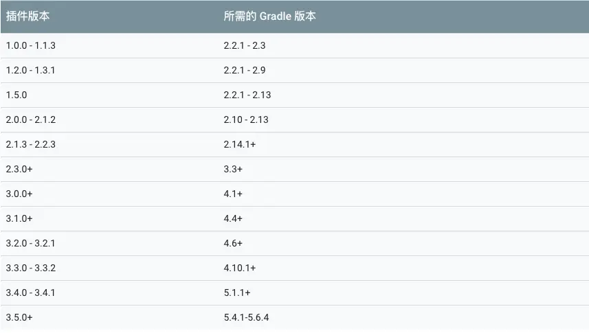 - Android Gradle插件版本跟Gradle版本之间有对应关系,有时修改需要2个同时修改,它们的对应关系如下图: