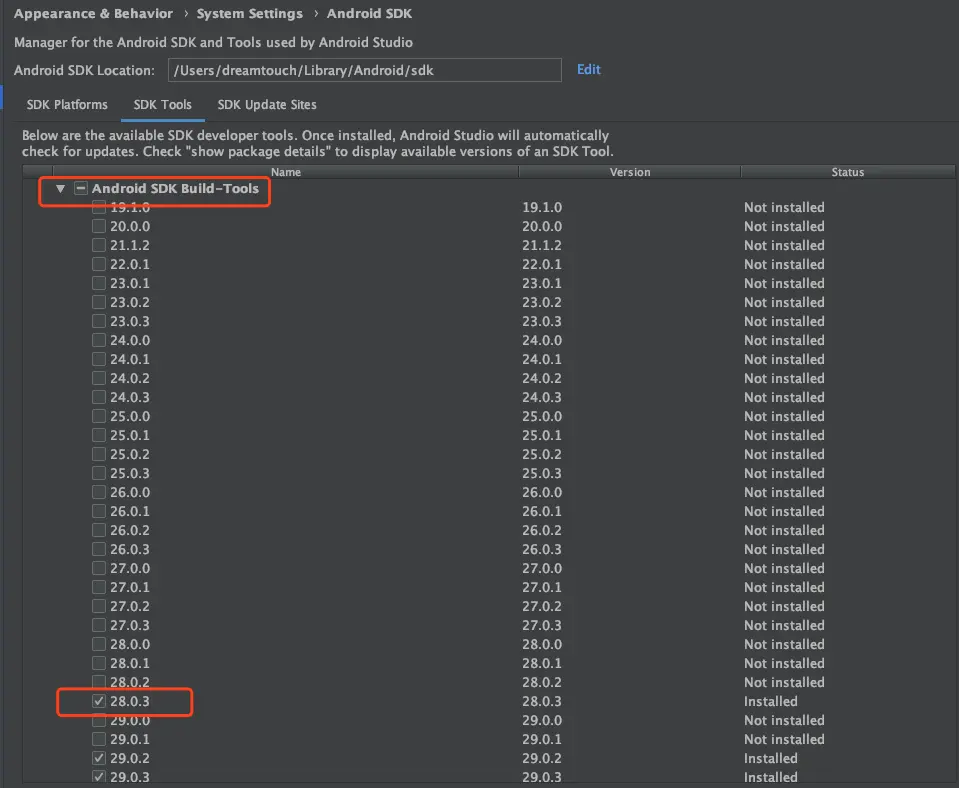 - Android Gradle插件版本跟Android SDK Build-Tools也有关系,如Android Gradle插件3.5.0需要SDK Build-Tools 28.0.3或以上的版本,如下图: