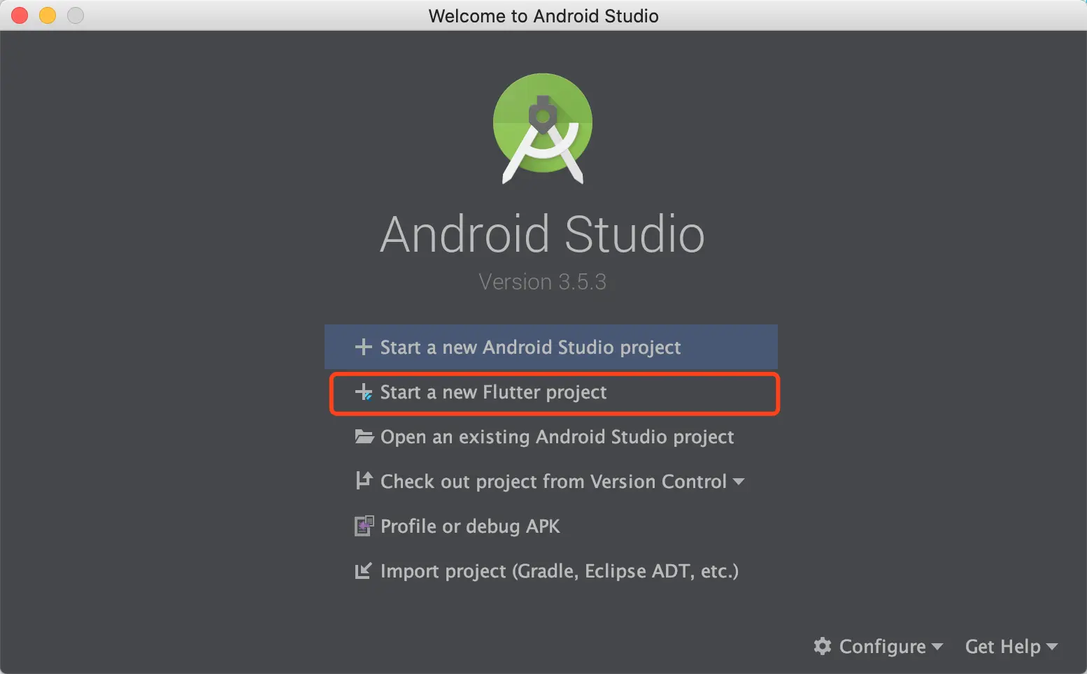 如果按照前文Flutter SDK,以及在Android Studio正确配置Flutter Plugins插件后,启动Android Studio可以看到以下界面: