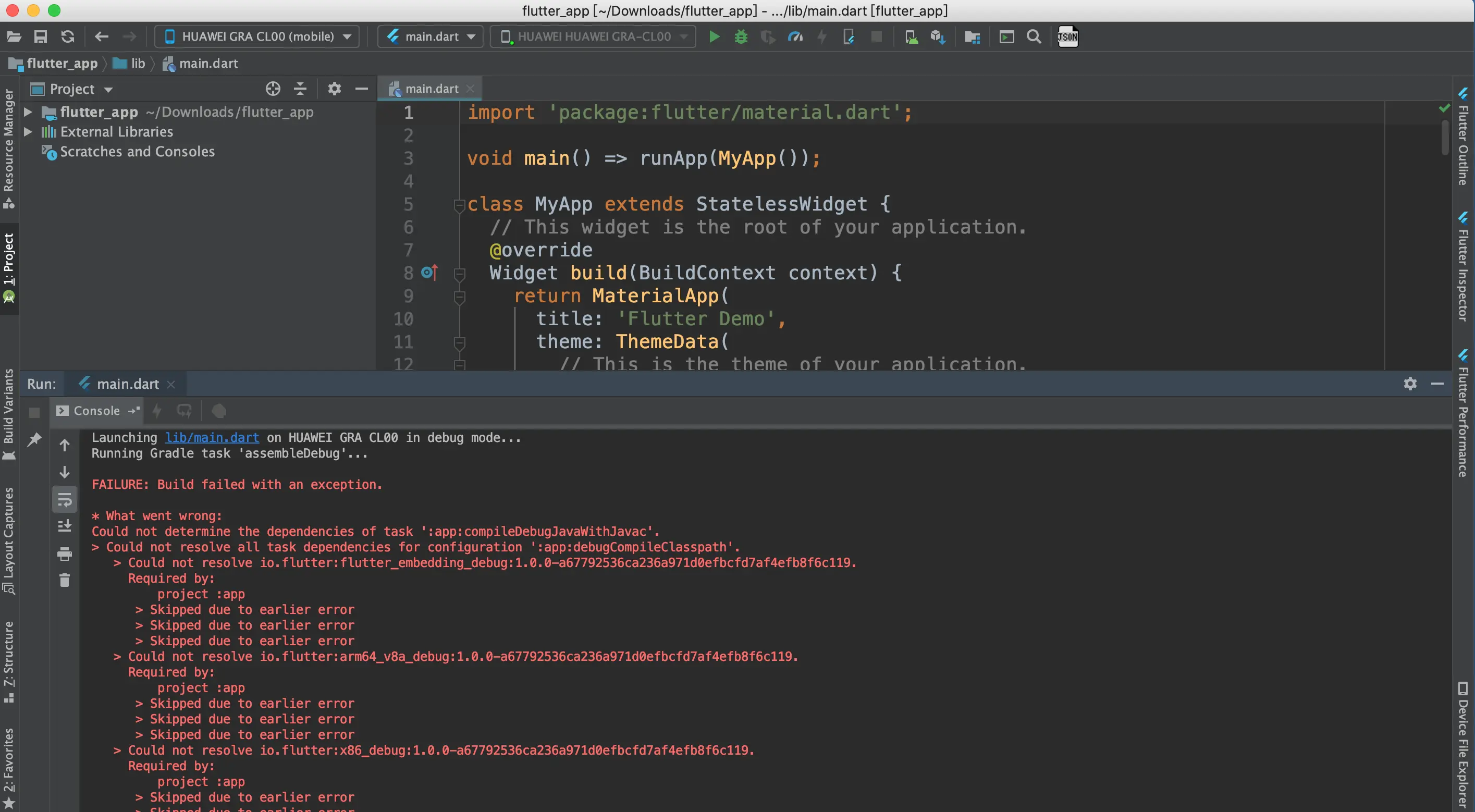 打开File->Project Structure检查,可以看到: Gradle没有正确配置好。关闭当前项目,File->Open,打开当前项目下的Android目录,可以看到如下: 然后,Gradle Sync重新执行一遍。如同步成功,关闭当前项目,重新打开之前的Flutter项目即可。